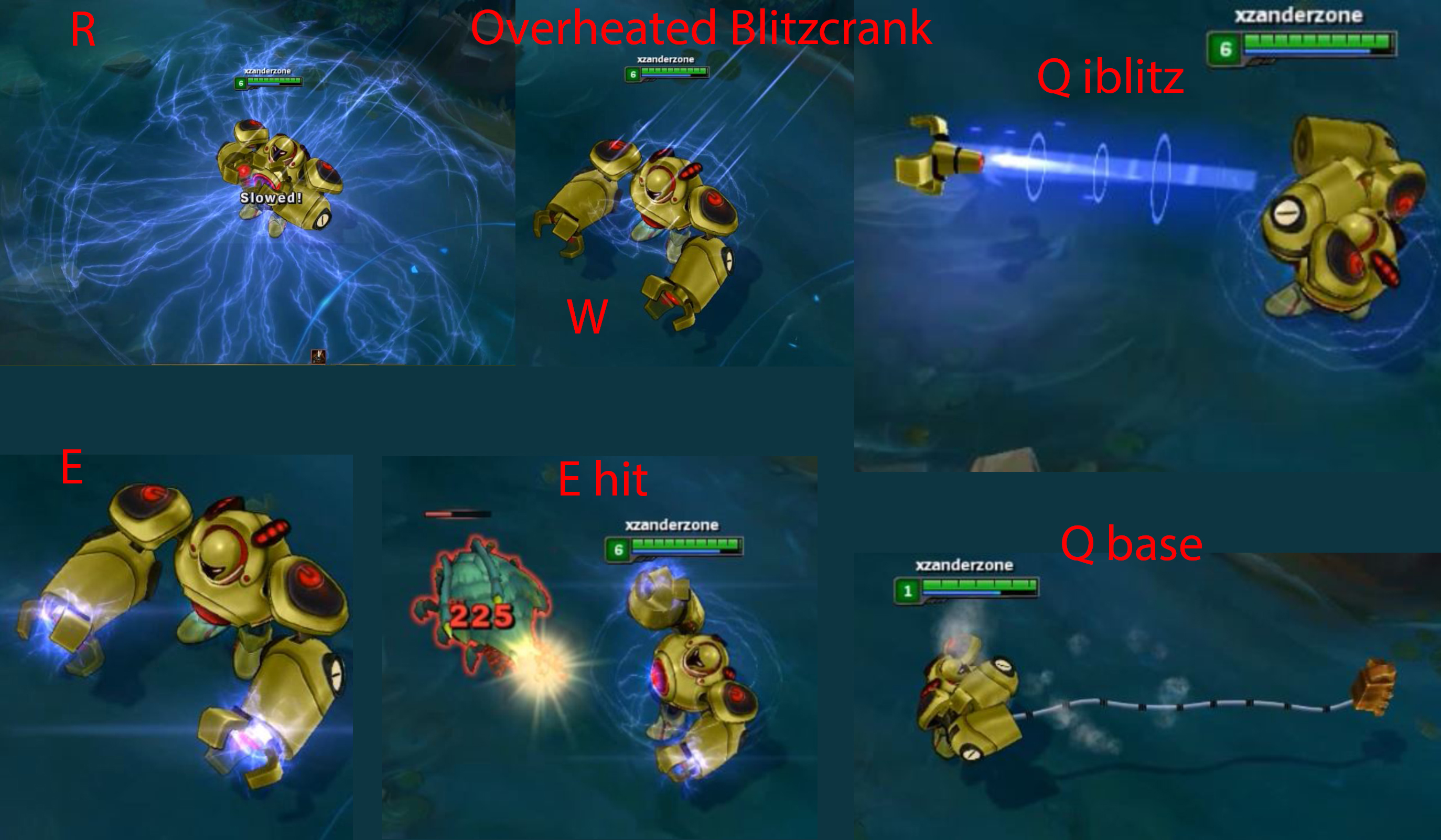 Overheated Blitzcrank is the iblitzcrank model with recolored skin and q particles to gold/red ,unfortunately the base blitzcrank does not seem to have any file for his q animation , so this is still the basic.