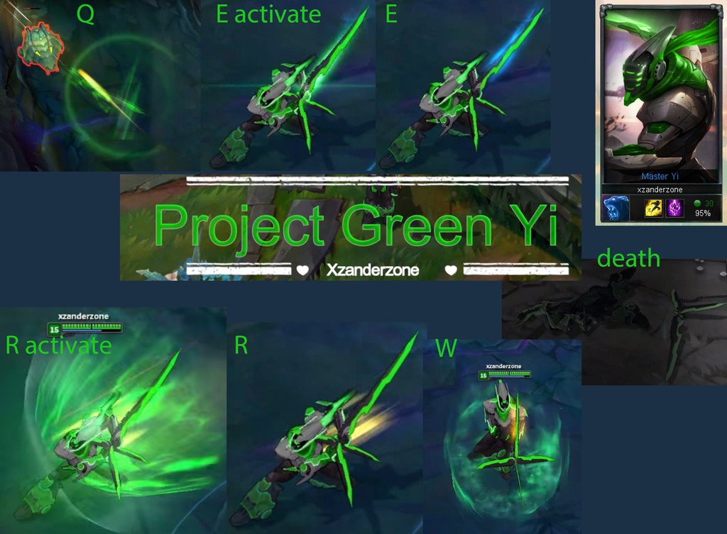 Project Green Yi is the Project Yi (ult)model with recolored particles (q,w,e,r,death animation,passive,…) and also loading screen and the champ itself to a bright green color.