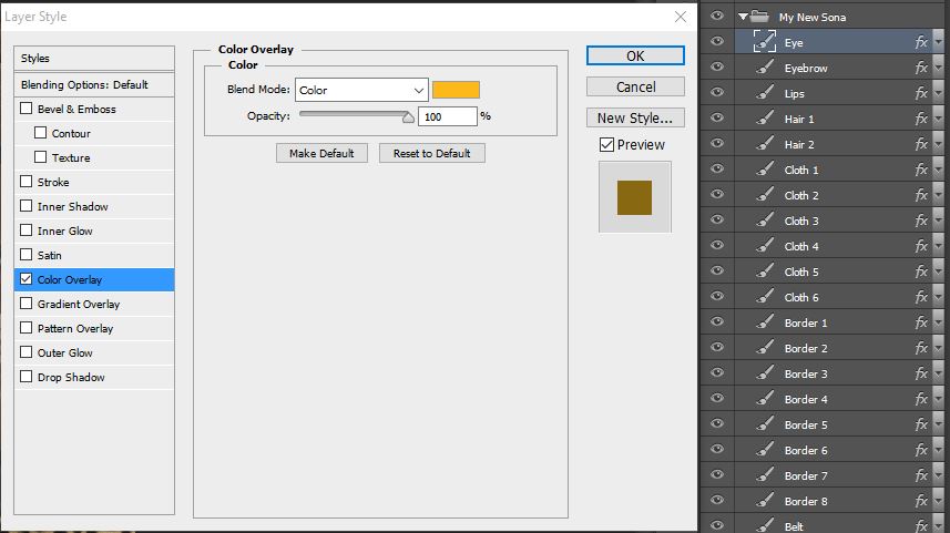 The layers were named after my personal style of layering them, but you can name them as you wish, like more specific names, or names that make more sense to you. If you double-click a layer, you will be presented with a window called Layer Style. This is a very important window which will be extensively covered in this tutorial. Let’s check the Eye layer, double-click it and select the tab Color Overlay. You should see the window below: