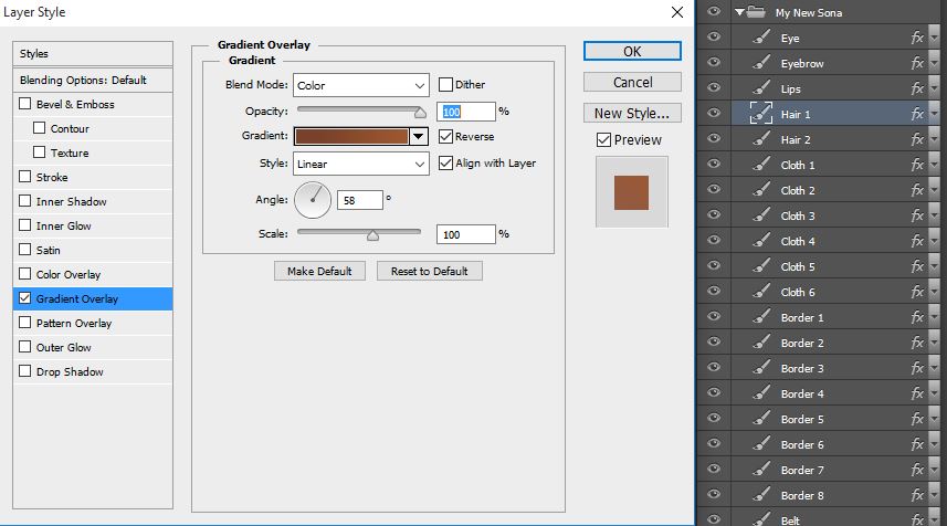 Ok, now let’s check the Hair 1 layer, double-click it and you shall see that this time, a Gradient Overlay is being used instead of a Color Overlay. A Gradient is a smooth transition between two or more colors, rotated by a certain angle, in this case we are using a brown gradient, linear with 58º angle, this will make our hair not look a “pure brown” or a boring single color. The Gradient Overlay is an extremely useful Layer Style that you will love to use to make beautiful skins.