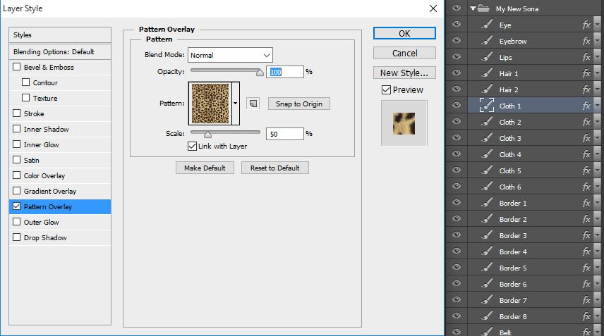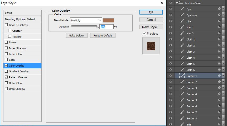 Now look how interesting. This Layer has two styles, one blending with the other, how is that possible? Thanks to PS, you can create styles mixing more than one Overlay at the same time, and checking the result to see if you are satisfied with it. In this Border 1, you can see the use of a Pattern plus a Color Overlay above it. In practice, I’m multiplying a brown color tone over an already implanted pattern to create a dark brown pattern over the border of the cloth. Imagine this like an alchemy of styles, blending and mixing overlays to create your own personal style, how amazing is that? Try to play with them, modify them to anything you wish and see the results on the screen, they will appear in real-time with the little box “Preview” (enabled by default) and you can see if you are in the right track.