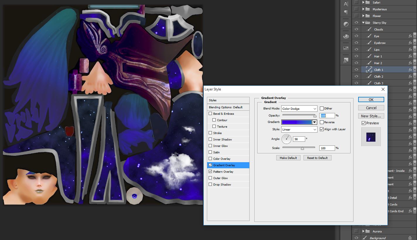 Now, let’s see about implanting patterns, very useful for clothes. Double-click the Cloth 1 layer to see the Pattern Overlay being used in the cloth. You can use your favorite patterns to create cloth material, or objects, like iron material, stones, jewels, fabric, wood etc.