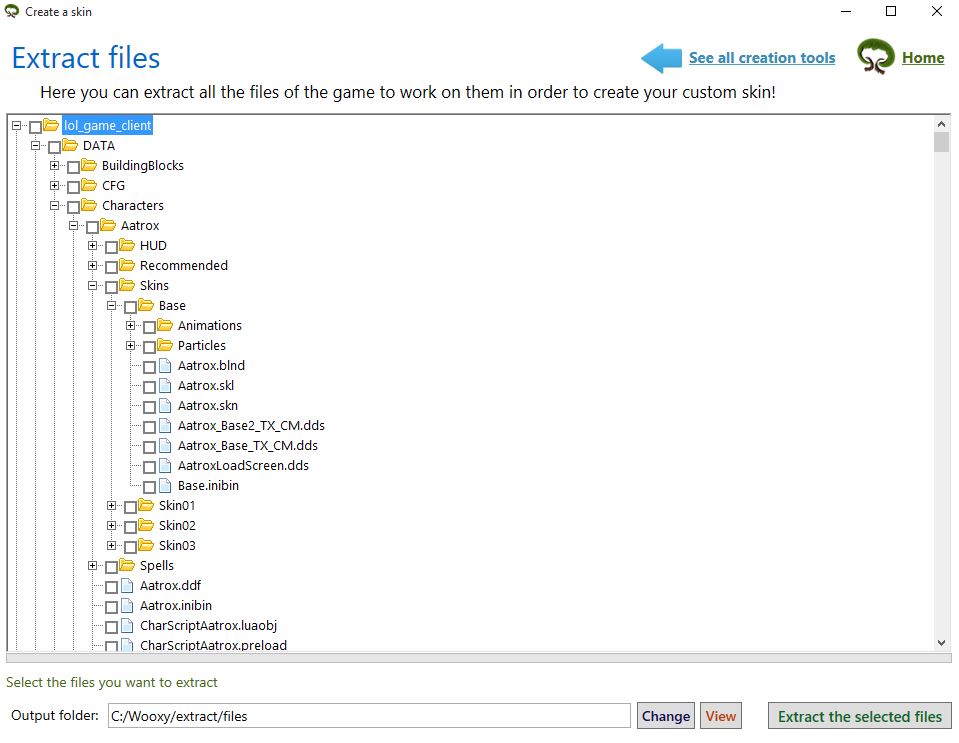 Open Wooxy and make sure it’s totally updated (both your game and Wooxy), if it’s not updated, you will see a small button in the corner written “Update”, pretty straightforward if you ask me… Then go to “Creation tools” => “Get files”. You will see a list of folders and all the files from the game. Open up the small folders by clicking in the + icon before them, “lol_game_client/DATA/Characters/Aatrox/Skins/Base” like the picture below: